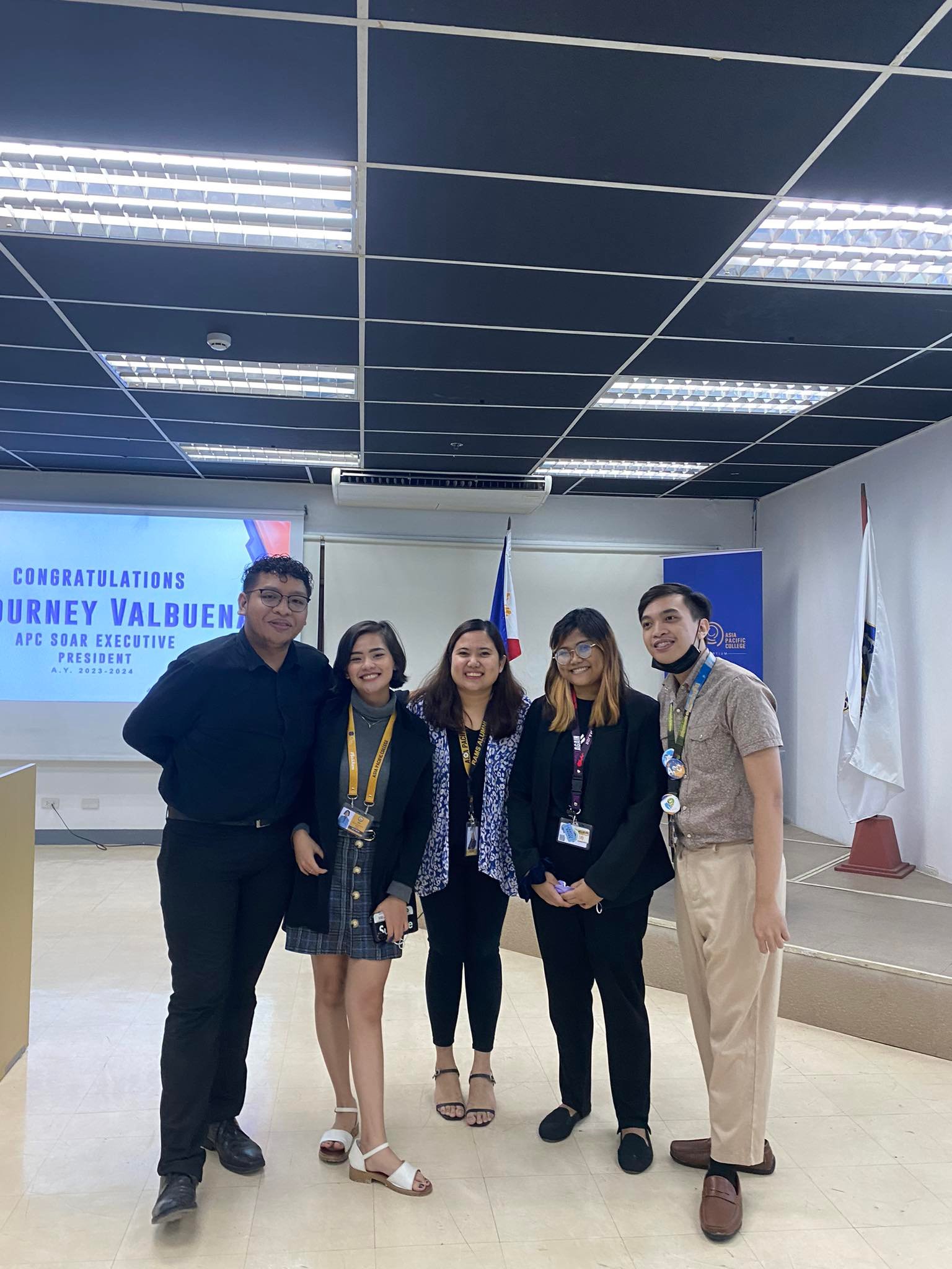 Attendees of the event are the outgoing officers of APC SOAR, Student Activities Office (SAO) Head Ms. Revvie Congson, and three representatives from the recognized and accredited school organizations of APC.
