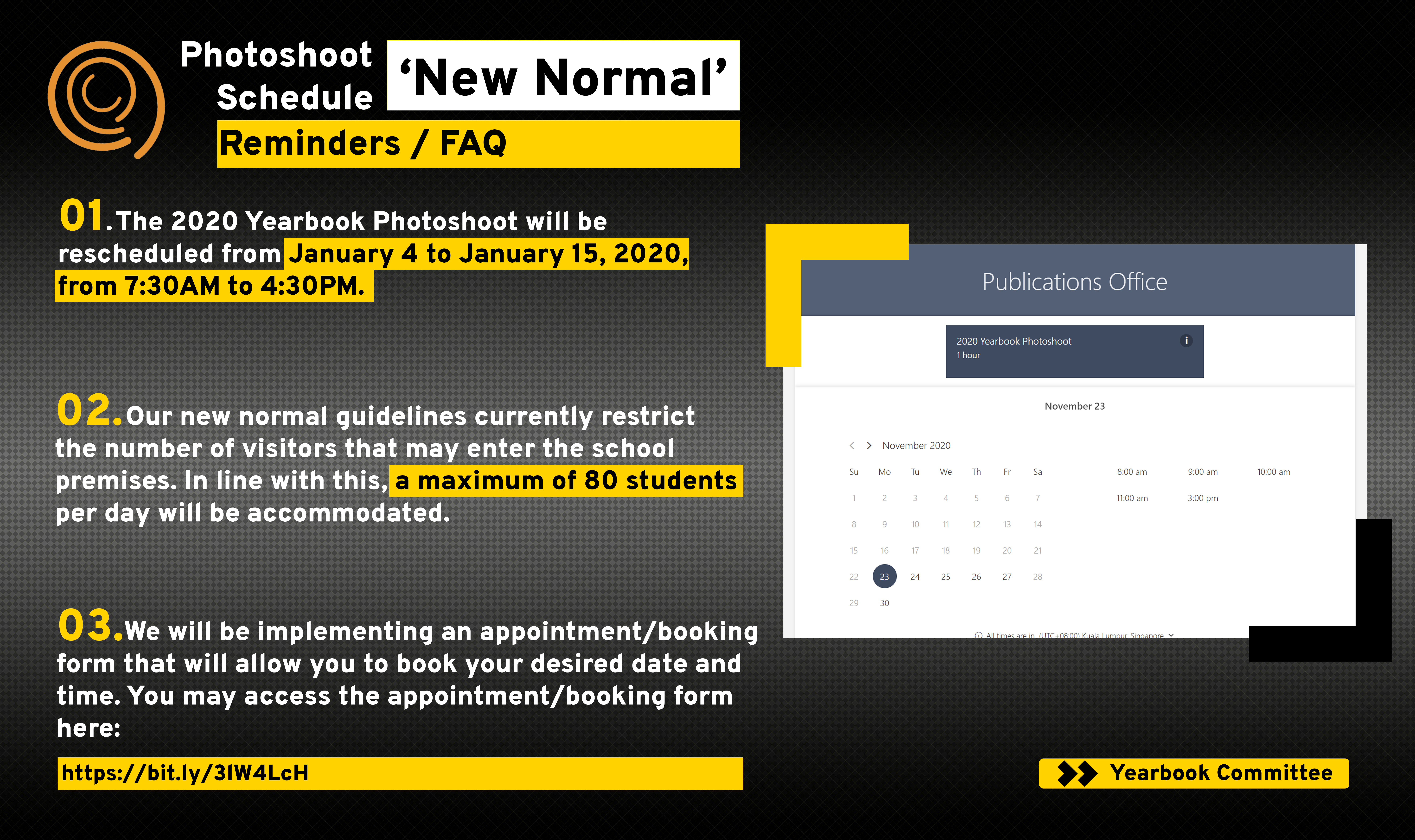 1. The 2020 Yearbook Photoshoot will be rescheduled from January 4 to January 15, 2020, from 7:30AM to 4:30PM.