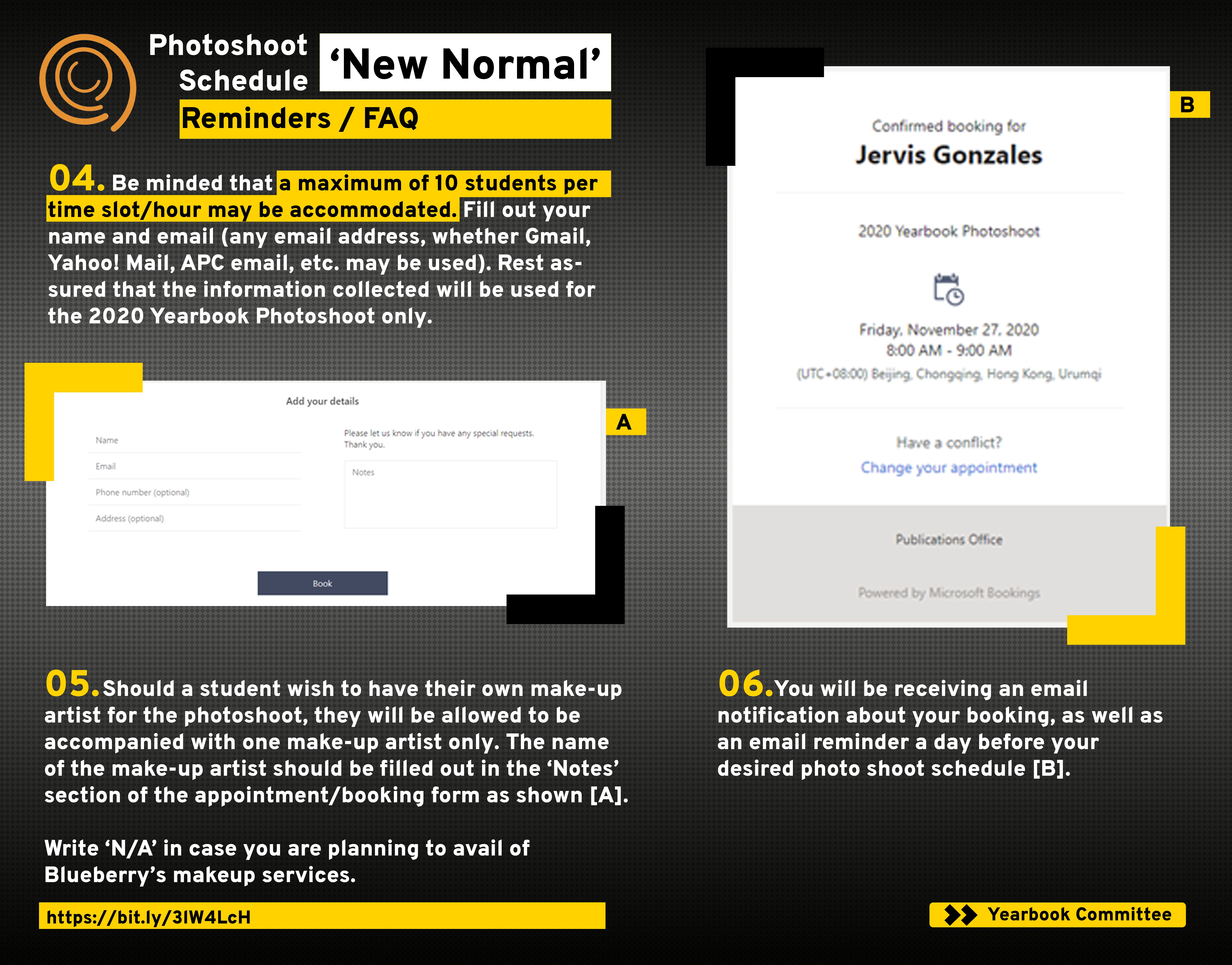 4. Be minded that a maximum of 8 students per time slot/hour may be accommodated. Fill out your name and email (any email address, whether Gmail, Yahoo! Mail, APC email, etc. may be used). Rest assured that the information collected will be used for the 2020 Yearbook Photoshoot only.