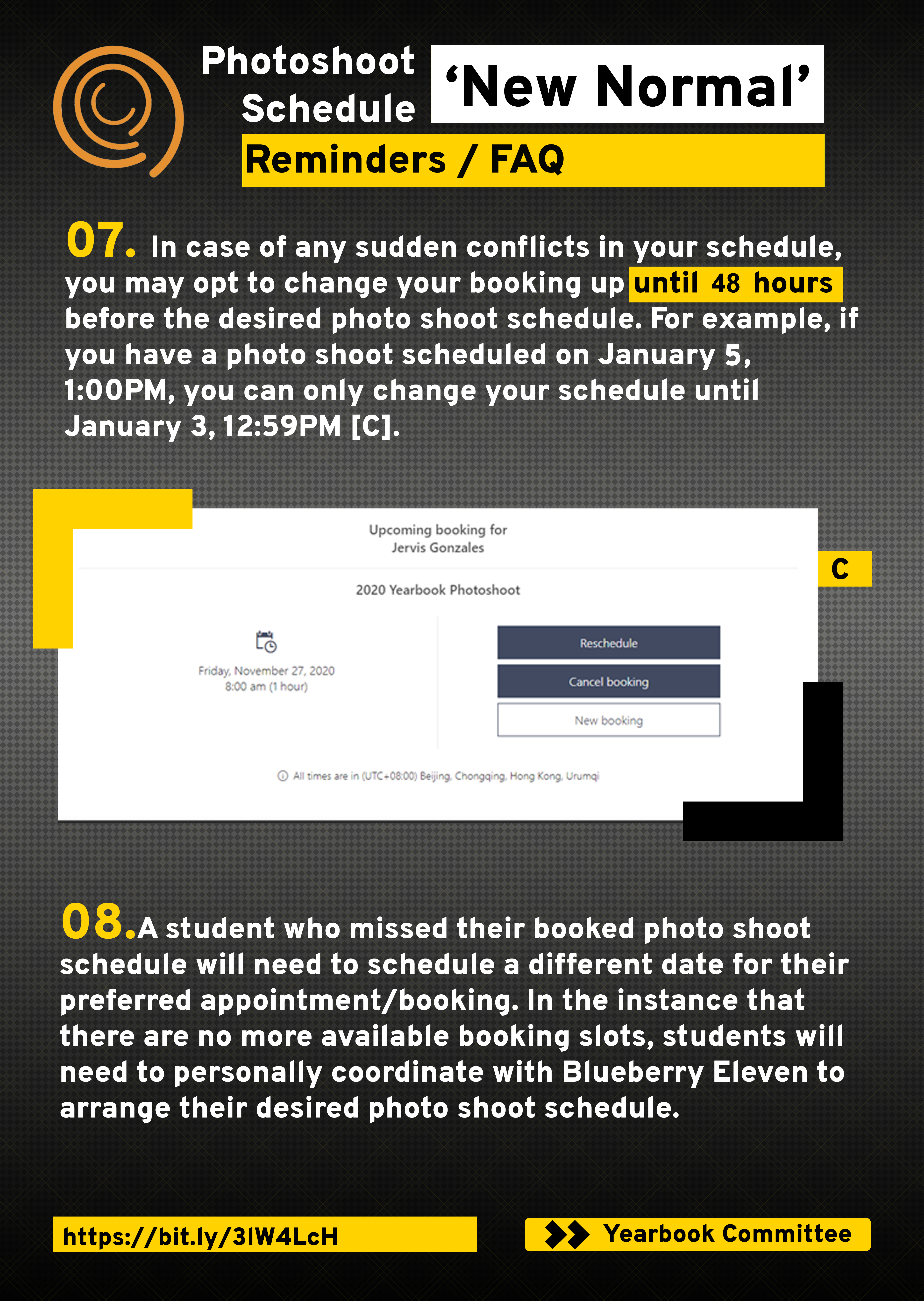 8. A student who missed their booked photo shoot schedule will need to schedule a different date for their preferred appointment/booking. In the instance that there are no more available booking slots, students will need to personally coordinate with Blueberry to arrange their desired photo shoot schedule.