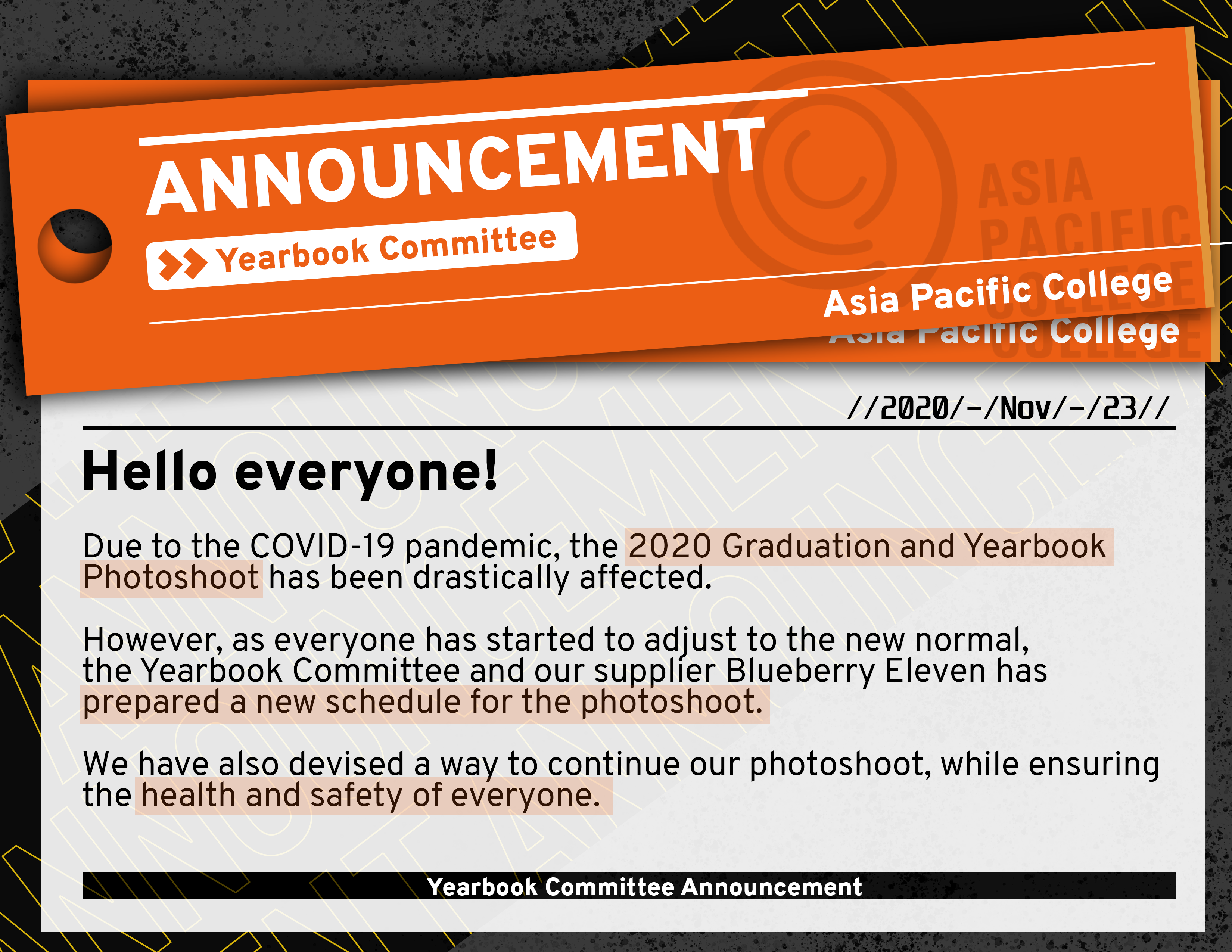Due to the COVID-19 pandemic, the 2020 Graduation and Yearbook Photoshoot has been drastically affected. However, as everyone has started to adjust to the new normal, the Yearbook Committee and our supplier Blueberry has prepared a new schedule for the photoshoot. We have also devised a way to continue our photoshoot, while ensuring the health and safety of everyone.